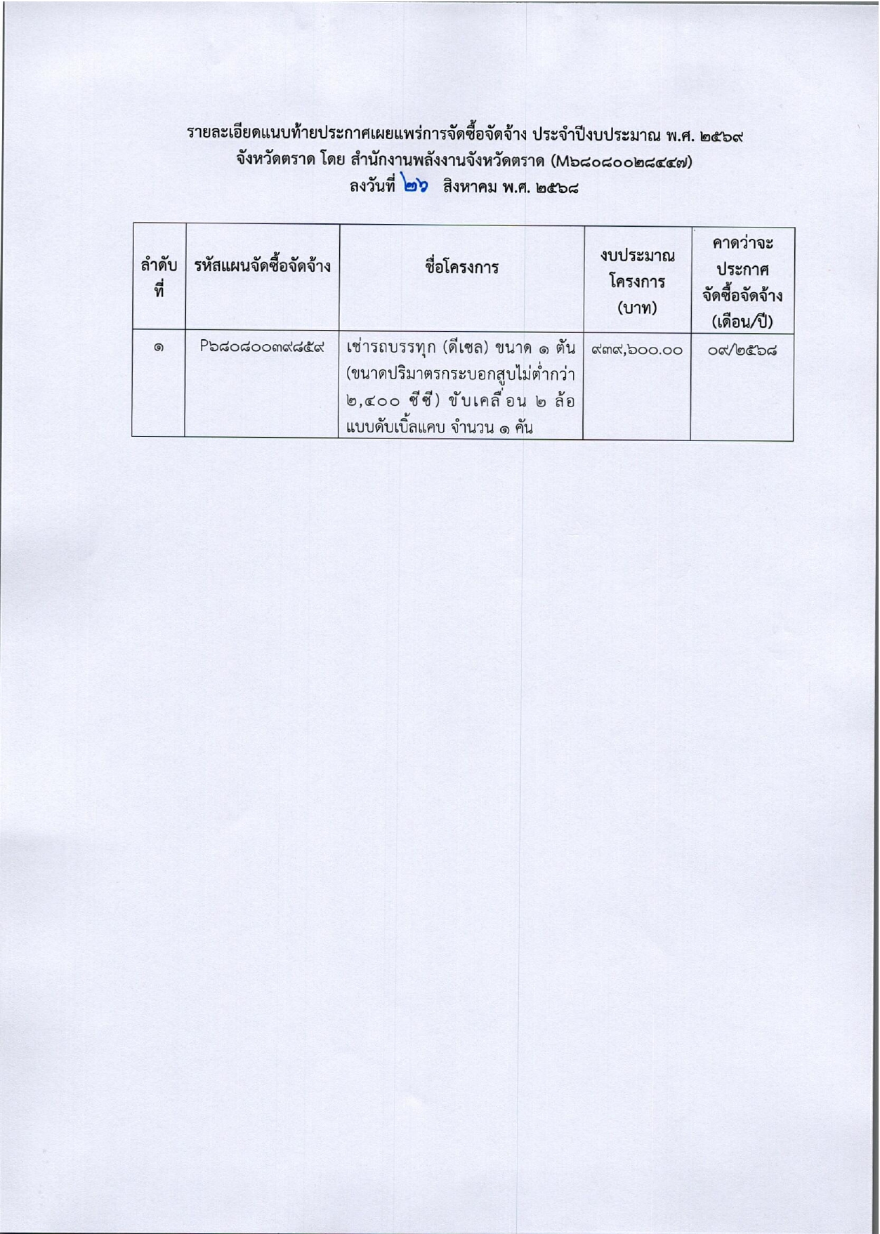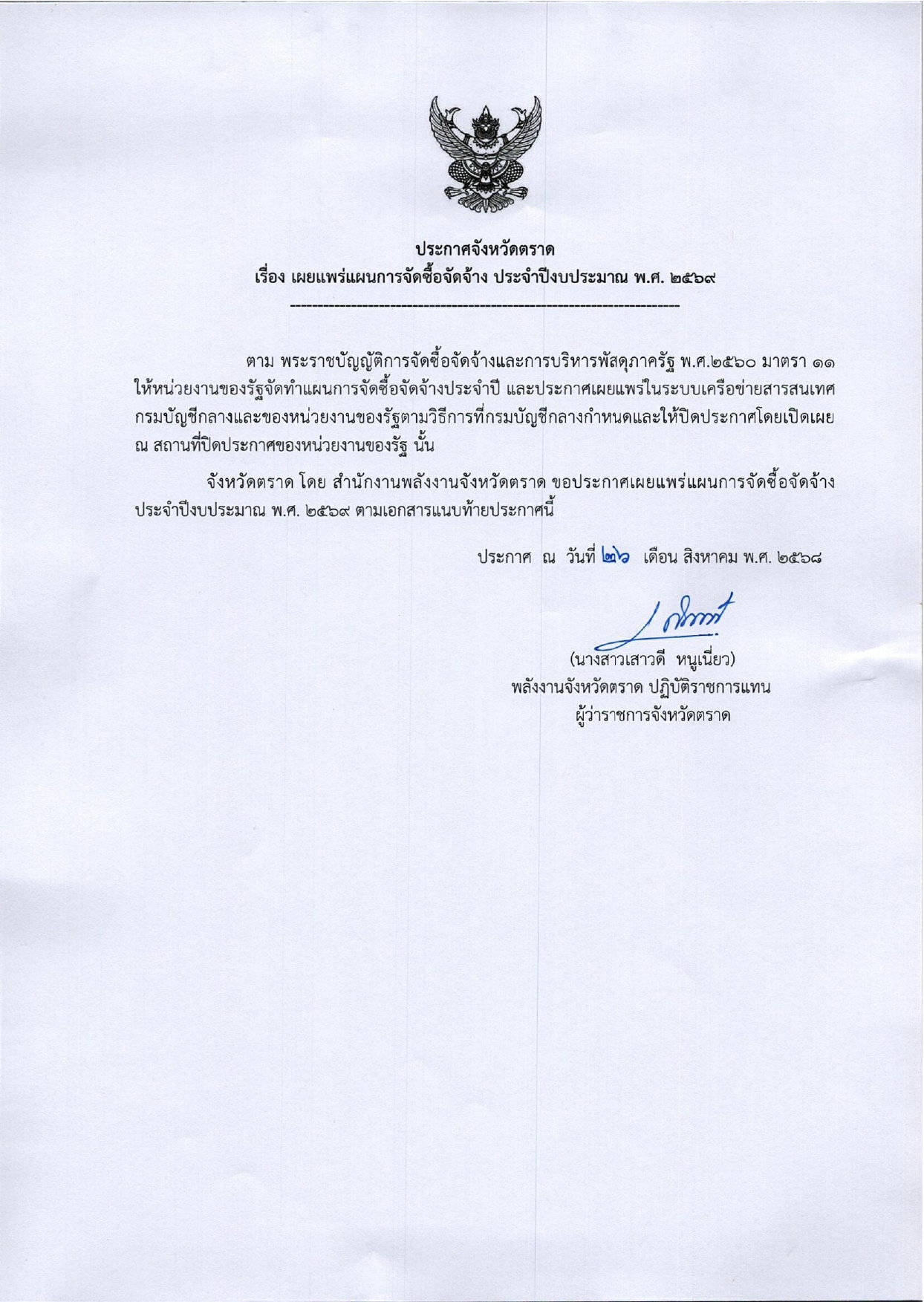ประกาศจังหวัดตราด เรื่องการเผยแพร่แผนการจัดซื้อจ้ดจ้าง ประจำปีงบประมาณ พ.ศ.2569