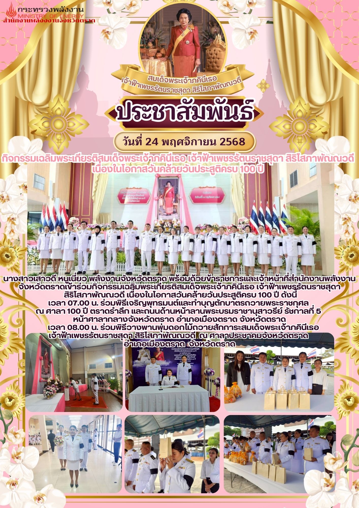 นางสาวเสาวดี หนูเนี่ยว พลังงานจังหวัดตราด พร้อมด้วยข้าราชการและเจ้าหน้าที่สำนักงานพลังงานจังหวัดตราดเข้าร่วมกิจกรรมเฉลิมพระเกียรติสมเด็จพระเจ้าภคินีเธอ เจ้าฟ้าเพชรรัตนราชสุดา