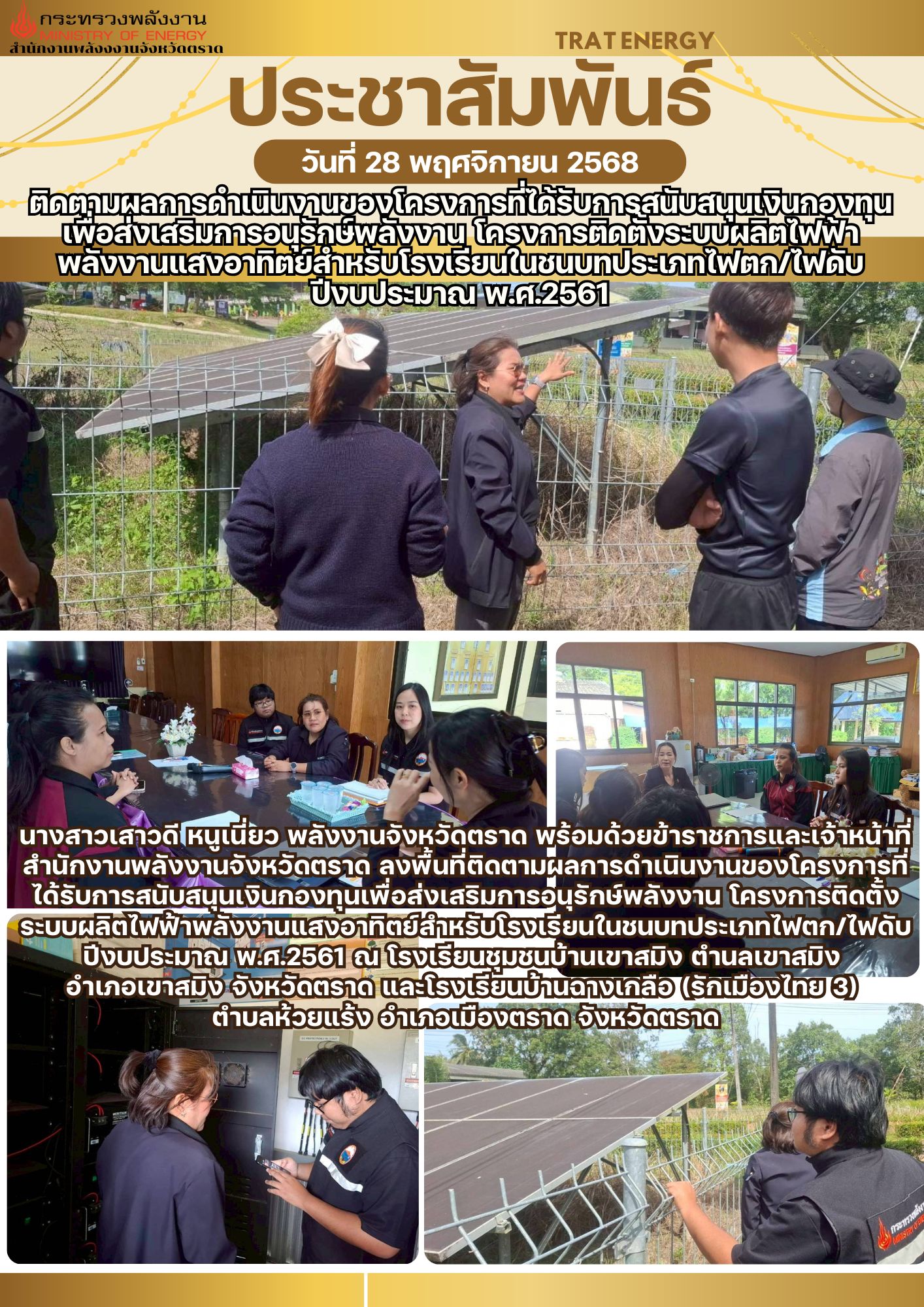 นางสาวเสาวดี หนูเนี่ยว พลังงานจังหวัดตราด พร้อมด้วยข้าราชการและเจ้าหน้าที่สำนักงานพลังงานจังหวัดตราด ลงพื้นที่ติดตามผลการดำเนินงานของโครงการที่ได้รับการสนับสนุนเงินกองทุนเพื่อส่งเสริมการอนุรักษ์พลังงาน โครงการติดตั้ังระบบผลิตไฟฟ้าพลังงานแสงอาทิตย์สำหรับโรงเรียนในชนบทประเภทไฟตก/ไฟดับ ปีงบประมาณ พ.ศ.2561 ณ โรงเรียนชุมชนบ้านเขาสมิง ตำนลเขาสมิง อำเภอเขาสมิง จังหวัดตราด และโรงเรียนบ้านฉางเกลือ (รักเมืองไทย 3) ตำบลห้วยแร้ง อำเภอเมืองตราด จังหวัดตราด