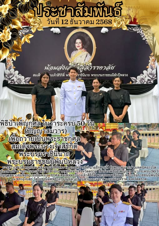 นางสาวเสาวดี หนูเนี่ยว พลังงานจังหวัดตราด มอบหมายให้ นายธีรศานต์ ชัยพฤกษ์ นายช่างเทคนิคอาวุโส พร้อมด้วยข้าราชการและเจ้าหน้าที่สำนักงานพลังงงานจังหวัดตราด เข้าร่วมพิธีบำเพ็ญกุศล ในวาระครบ 50 วัน (ปัญญาสมวาร)เพื่อถวายเป็นพระราชกุศล สมเด็จพระนางเจ้าสิริกิติ์ พระบรมราชินีนาถ พระบรมราชชนนีพันปีหลวง ณ พระอุโบสถ วัดโยธานิมิตพระอารามหลวง ตำบลวังกระแจะ อำเภอเมืองตราด จังหวัดตราด
