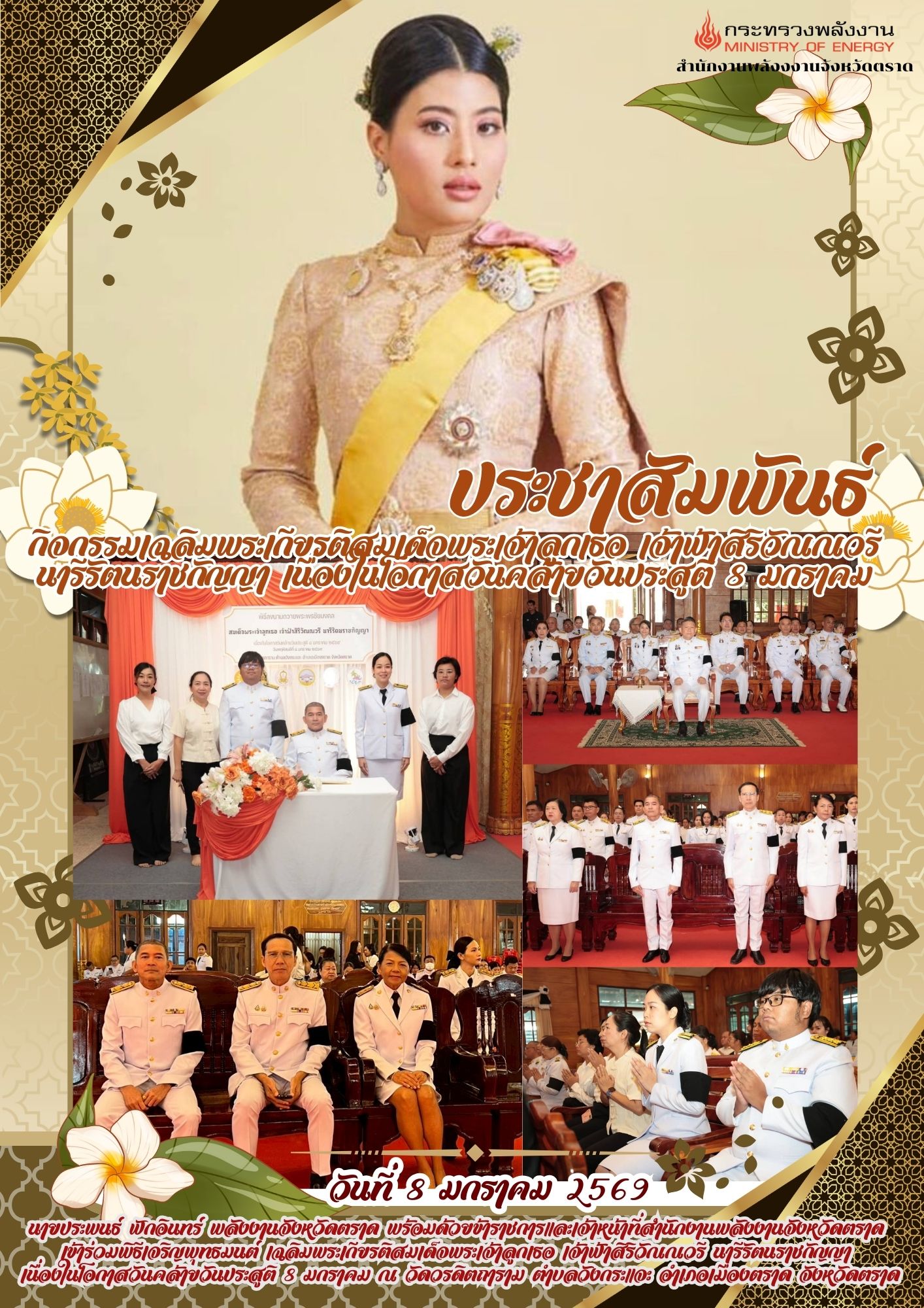 นายประพนธ์ ฟักอินทร์ พลังงานจังหวัดตราด พร้อมด้วยข้าราชการและเจ้าหน้าที่สำนักงานพลังงานจังหวัดตราดเข้าร่วมพิธีเจริญพุทธมนต์ เฉลิมพระเกียรติสมเด็จพระเจ้าลูกเธอ เจ้าฟ้าสิริวัณณวรี นารีรัตนราชกัญญา